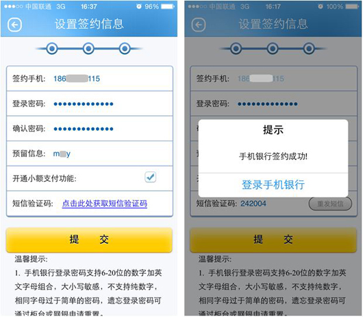 4)您在自助注册手机银行时,请将登录密码设置为6-20位的数字加英文字母,并交叉使用大小写字母,慎用纯数字、相同字母等过于简单的密码;预留信息支持3-10位字符,请使用普通而不是特殊字符;当您签约手机号与在我行开户时预留的手机号不相同时,则无法开通小额支付功能,请您确保手机号的一致性。