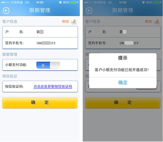 3)如果您使用民生“借记卡”或“活期一本通”账户且手机银行账户管理项下没有“信用卡”账户,或者您手机银行账户管理项下没有任何账户,当您进入限额管理页面时,将回显户名和签约手机号,您可选择开通小额支付功能,获取并通过短信验证码验证后,即可使用手机银行进行缴费支付交易了。