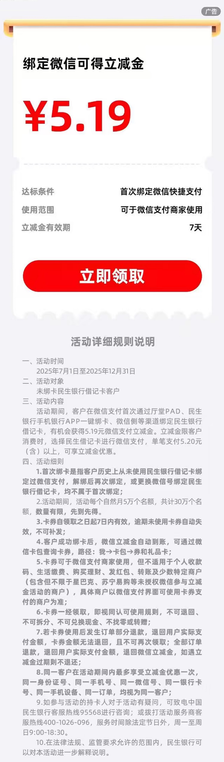 民生借记卡首次绑定微信快捷支付可得5.19元立减金
